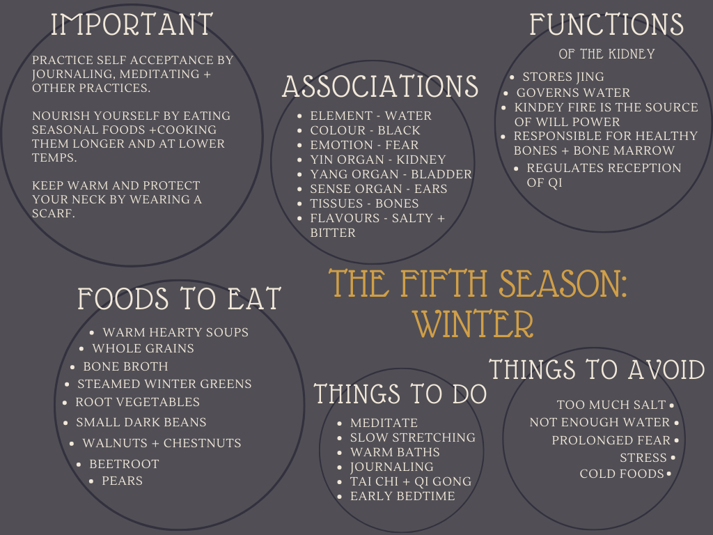 We’ve all felt it. The deep need to lay low, stay cozy and rest when the temperature drops. The urge to hibernate. In TCM, Winter is the time to take a pause, reflect inward and regenerate energy for the coming Spring. Your kidneys and bladder are the stars of this season, they are the source of your most basic and fundamental energy, your Jing.  Kidneys are the Yin organ while your Urinary Bladder is the Yang. They play a huge role in fluid regulation. With each new season comes it’s corresponding element, for winter this means water. Meaning when your energy isn’t flowing optimally, you will really feel it. The deep watery depths of winter help us replenish what we have put out that year. Water brings all the elements back around, and emphasises this time for self reflection.