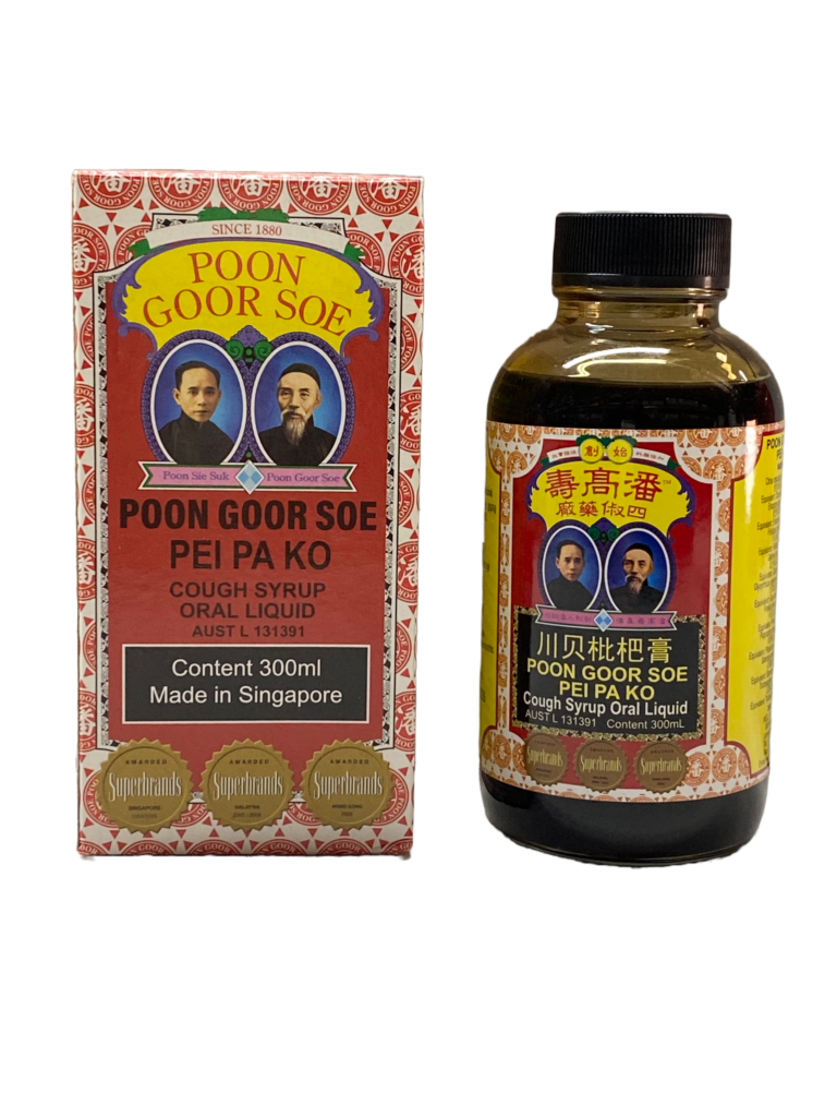 In English Poon Goor Soe’s Pei Pa Lo syrup translates to Bulbus Fritillaria Cirrhosae and Loquat syrup.